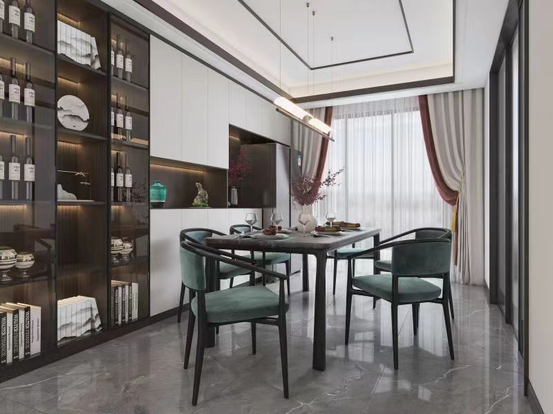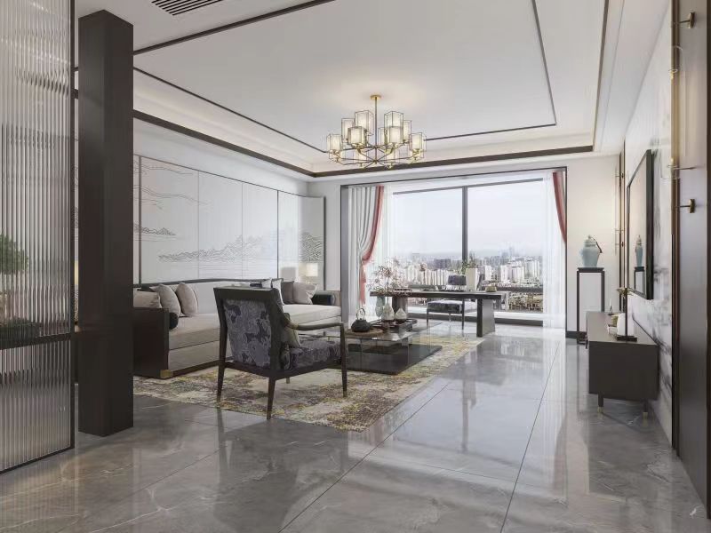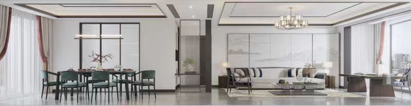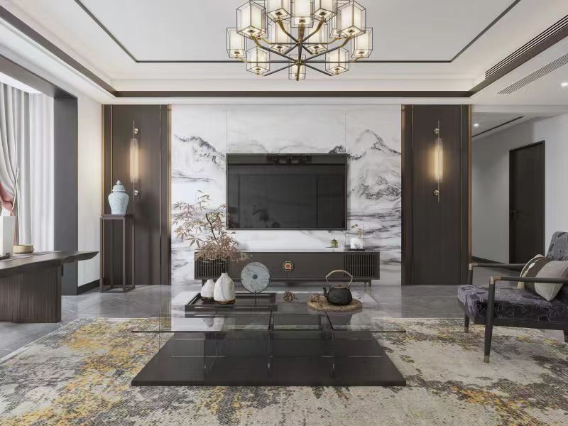 客厅借山水、莲花、窗棂、奇石等元素,穿越古今,延展时间的纹理。一屏一椅,一窗一景。追求着清雅、超凡的东方意境。一花一世界,一叶一菩提。一念一清静,心似莲花开。在“虚与实”、“显与隐”间相互作用,形成具有东方文化的视觉张力。
